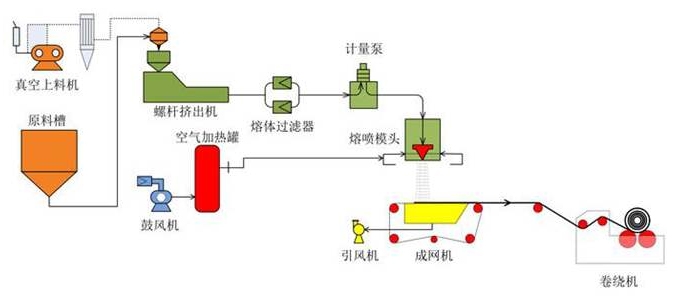 自動上料機自動吸入拉絲級聚丙稀送至擠出機,擠出機加熱熔化PP顆粒至液態(tài)。羅茨鼓風機或空壓機和儲氣罐壓縮空氣送至烘箱加熱,熱空氣通過壓力使熔化成液態(tài)的聚丙烯材料從噴頭噴射而出形成絲狀物(噴頭內(nèi)含數(shù)以百計的小孔)后,噴出的絲狀物水平到達接收設(shè)備,然后用滾壓機軋制無紡布。
